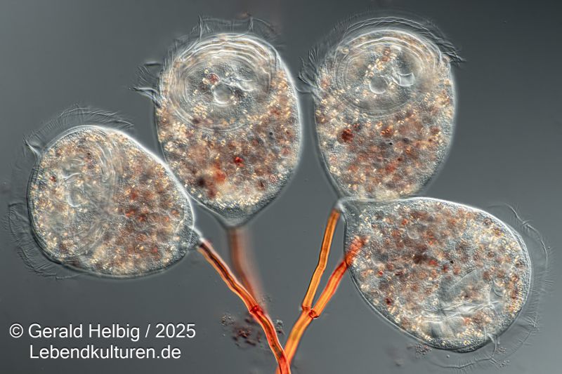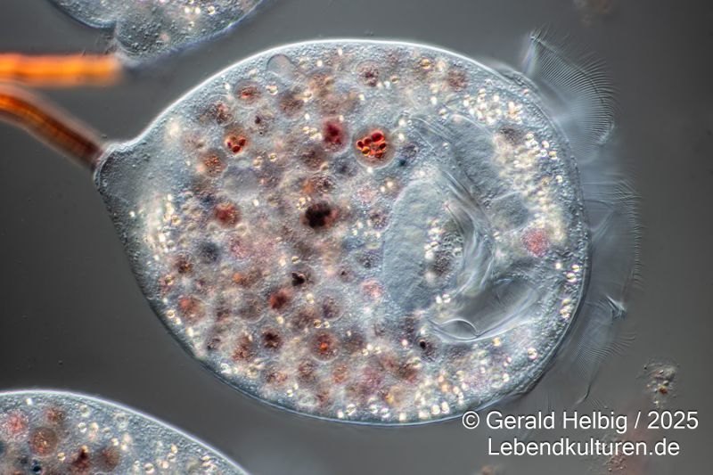 Eine dichte Kultur Paramecium caudatum, Paramecium bursaria oder Colpidium striatum wird in ein Blockschälchen pipettiert und ein Tropfen der gefärbten Hefezellen zugesetzt. Sofort beginnen die Ciliaten die Hefezellen einzustrudeln und über Nahrungsvakuolen aufzunehmen. Nach ca. 15 Minuten können die Wimperntierchen auf einen Objektträger überführt werden und unter dem Mikroskop die Nahrungsaufnahme beobachtet werden.