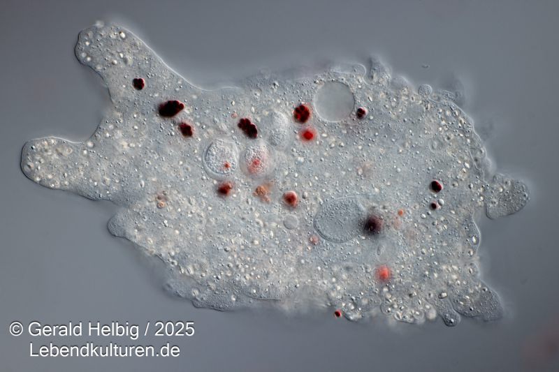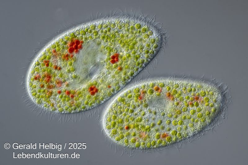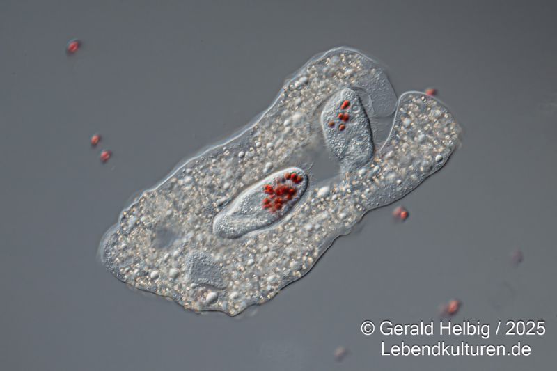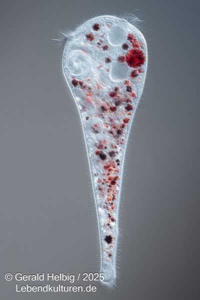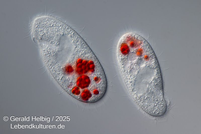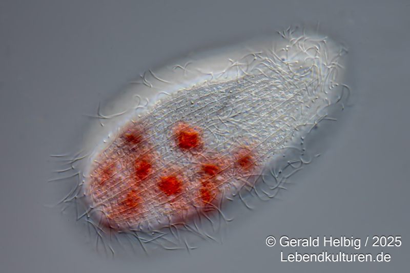 Eine dichte Kultur Paramecium caudatum, Paramecium bursaria oder Colpidium striatum wird in ein Blockschälchen pipettiert und ein Tropfen der gefärbten Hefezellen zugesetzt. Sofort beginnen die Ciliaten die Hefezellen einzustrudeln und über Nahrungsvakuolen aufzunehmen. Nach ca. 15 Minuten können die Wimperntierchen auf einen Objektträger überführt werden und unter dem Mikroskop die Nahrungsaufnahme beobachtet werden.